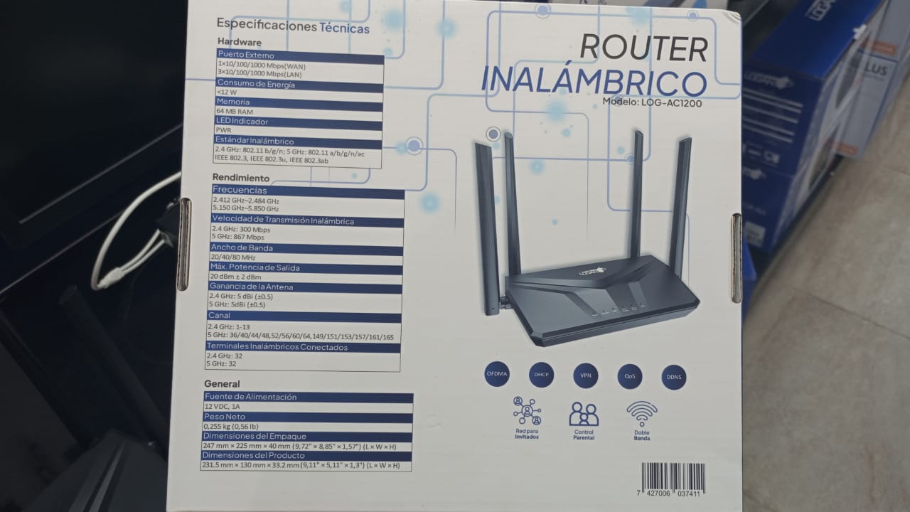 [L-WRAC4A1W3L-D] ROUTER INALAMBRICO AC1200 | MODELO LOG-AC1200 | DOBLE BANDA, VELOCIDAD DE 1.2 GBPS (300 MBPS @ 2.4 GHZ Y 867 GHZ @ 5 GHZ | COMPATIBLE CON ESTÁNDAR WIFI IEEE 802.11 B/G/N/AC | 4 ANTENAS EXTERNAS DE 5DBI | PROTECCIÓN WPA/WPA2 | CONTROL PARENTAL | TECNOLOGIA MU-MIMO | INTERFAZ: 1 PUERTO WAN, 3 PUERTO LAN | MARCA LOGAN